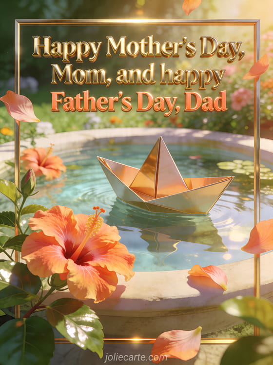 Send a balanced family greeting for mom and dad with photorealistic folded sailboats in a bright garden basin, vivid hibiscus blooms, glossy leaves and festive reflections. Discover also a free happy father's day card, the best father's day card or happy day to dad.
