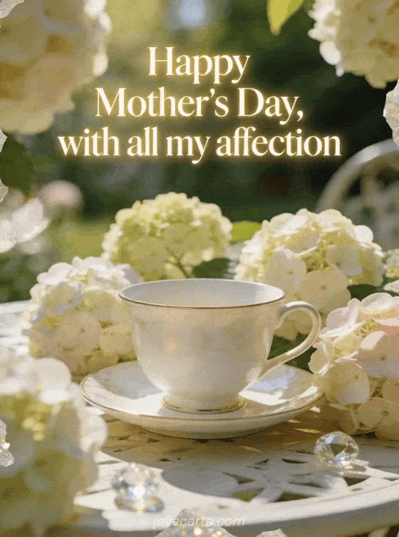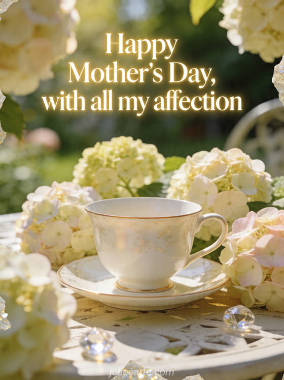 Send Happy Mother's Day mother-in-law with refined champagne lettering, a gentle glow, and a photorealistic porcelain teacup surrounded by full hydrangeas on a sunlit garden table. This affectionate card feels fresh, elegant, and bright. Discover also Mother's Day poems, texts for Mother's Day, or Happy Mother's Day images.