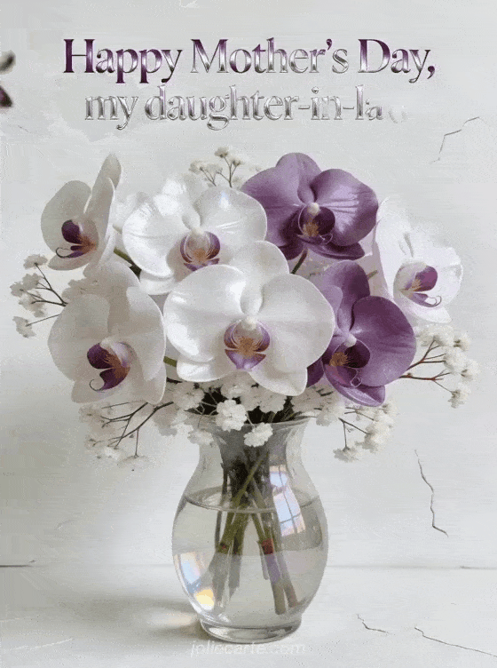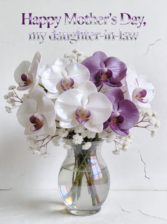 Send an elegant greeting with a refined bouquet of white and violet orchids in a clear glass vase, softened by gypsophila and natural light. You can also send happy Mother's Day, Mother's Day or Mother's Day drawings.