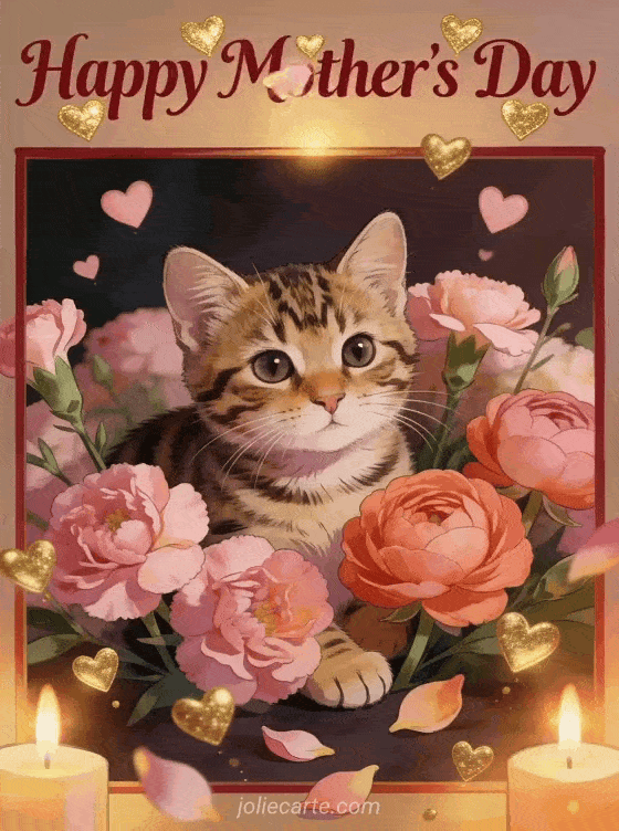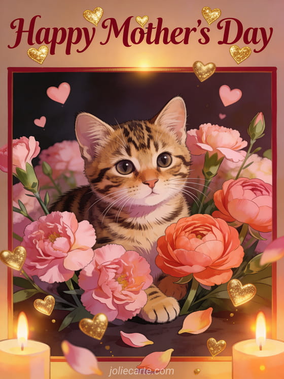 Express your love with this romantic happy mother's day my love card. A Bengal kitten nestled among lush pink and coral ranunculus blooms with floating golden hearts. Discover also a mother's day card or a mother's day card template.
