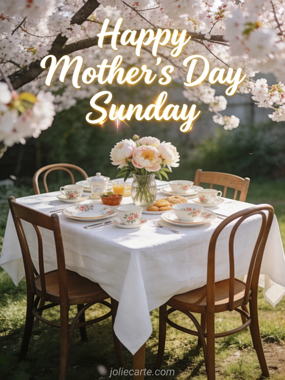 Share this bright Mother's Day card with an elegant outdoor brunch under cherry blossoms and peonies. Discover also happy mother's day card or free mother's day image.