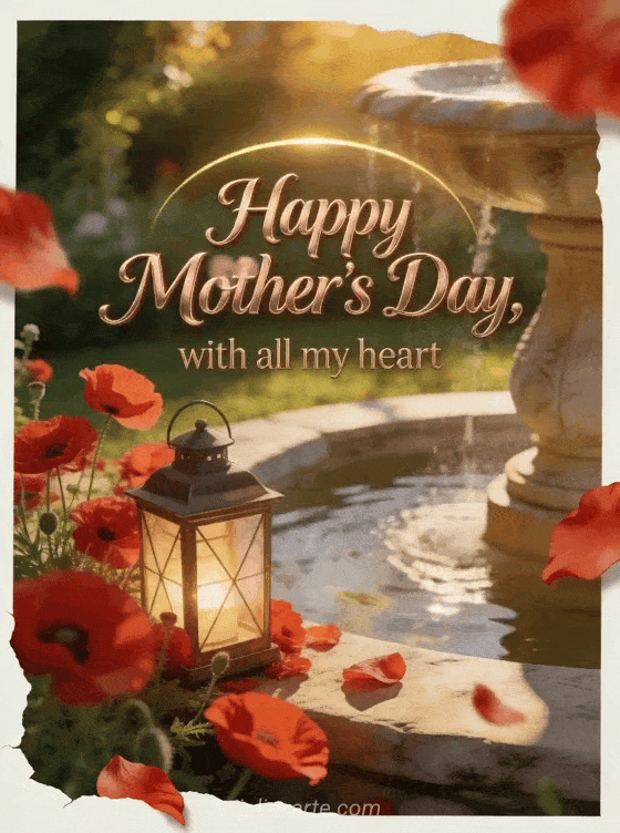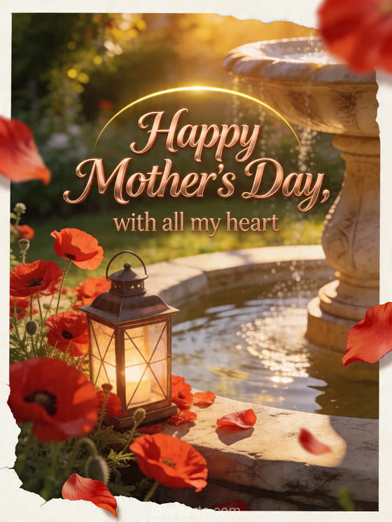 Share a heartfelt Mother's Day card with scarlet poppies, a glowing lantern, a stone fountain and golden garden light. Discover also Mother's Day photos, a short poem for Mother's Day or Mother's Day free images.