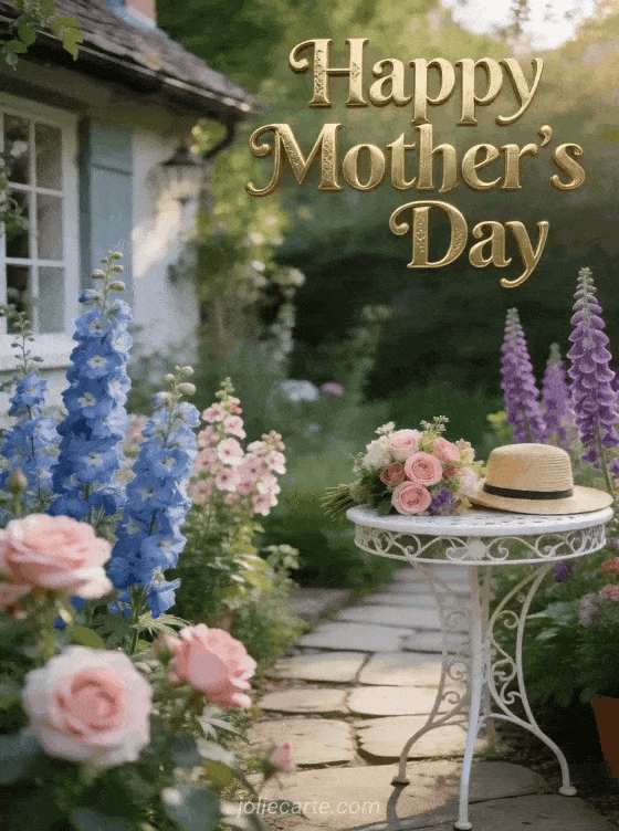 Share a bright happy Mother's Day card filled with golden lettering, cottage flowers, and warm afternoon light. Discover also a happy Mother's Day dear mom card, a Mother's Day image, or a poetry about Mother's Day.