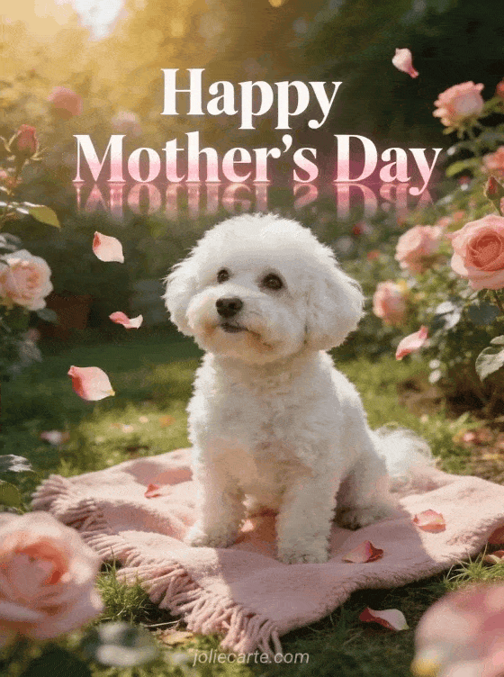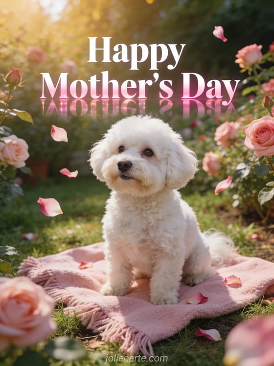 Share this tender happy mother's day card. A white bichon frise dog sits on a pink blanket in a rose garden with golden light and flying rose petals. Discover also a mother's day illustration or a happy mother's day gif.