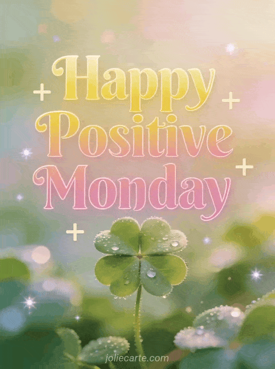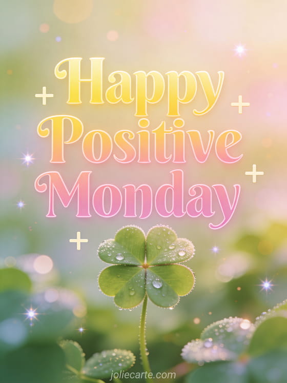 Share a cheerful happy positive Monday card with a four-leaf clover patch and morning dew. Start the week with luck and positivity. Discover also a have a great day monday card or a happy monday cat card.