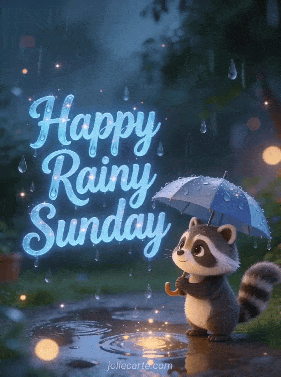 Share happy rainy Sunday with soft blue lettering, raindrop effects, a cute cartoon raccoon holding a tiny umbrella and puddles reflecting gentle lights. Discover also happy Sunday animated gifs or good morning sunday card.