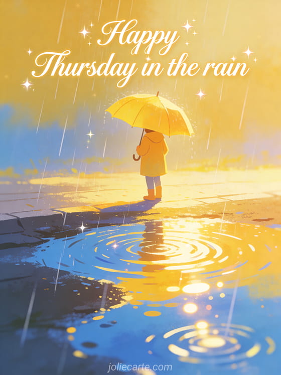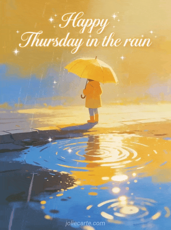 Share happy Thursday in the rain with smooth cursive, gentle sparkle, a yellow umbrella under lively rain, bright puddle reflections, and cozy warm lighting. Discover also good morning happy thursday sport image, cards to wish a happy Thursday, or beautiful animated happy Thursday images.