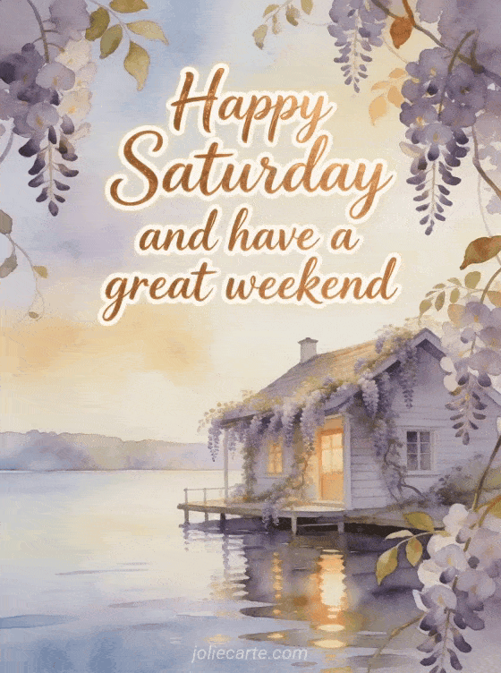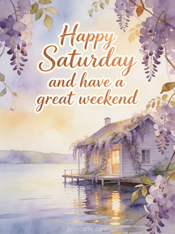 Share a calm happy Saturday and weekend greeting with a cozy cabin, bright lake reflections, and wisteria in soft watercolor. Discover also a free good morning Saturday image, a beautiful happy Saturday images, or a Saturday good day image.