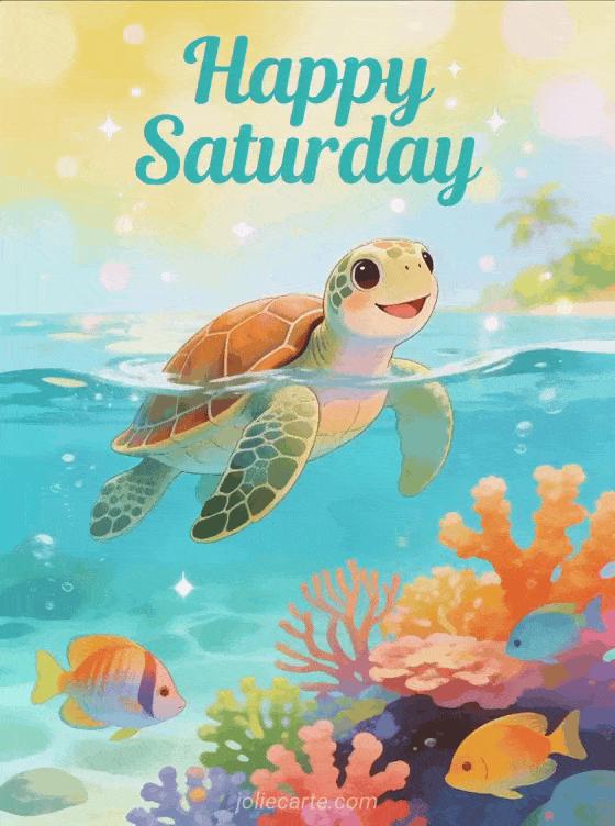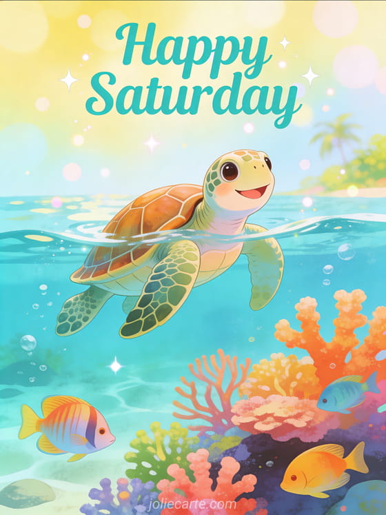 Share a sunny happy Saturday greeting with a cute sea turtle swimming in crystal-clear tropical water above a colorful coral reef and fish. Discover also a happy saturday image, happy Saturday images or a happy autumn saturday image.