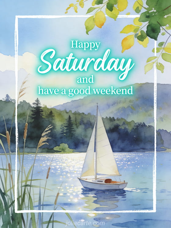 Wish happy Saturday and a good weekend with a watercolor lake scene, a small sailboat, wooded hills, reeds, and bright leaves in sunny calm. Discover also a happy Saturday flowers images card, sparkling happy Saturday images or image to wish a happy Saturday.