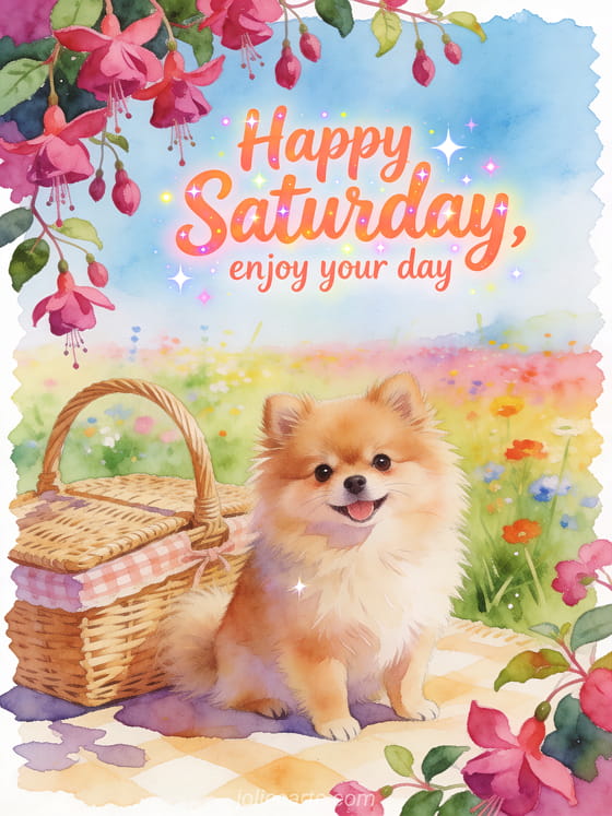 Share a happy Saturday animated gif with coral lettering, a miniature Pomeranian, a wicker picnic basket and hanging fuchsia flowers over a lively meadow. You can also send very happy saturday gif, free happy Saturday and good weekend images or happy saturday and weekend image.