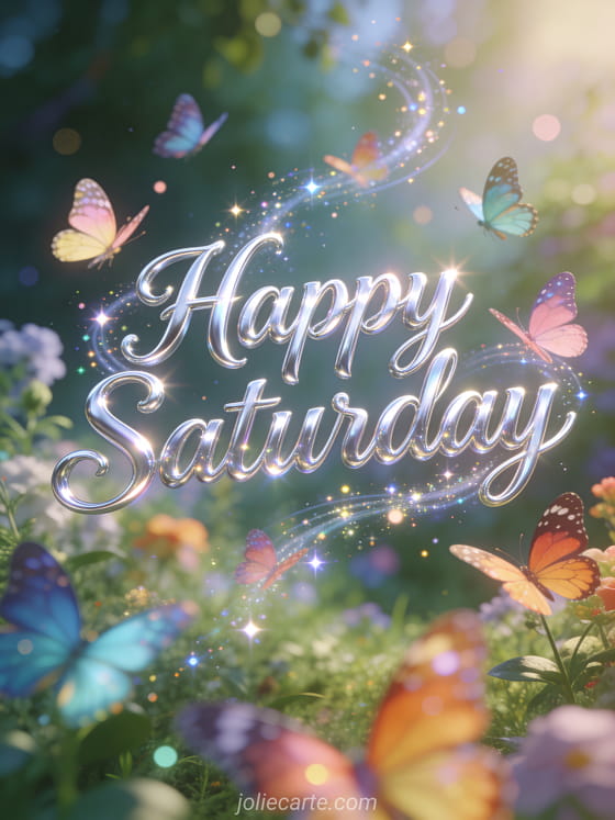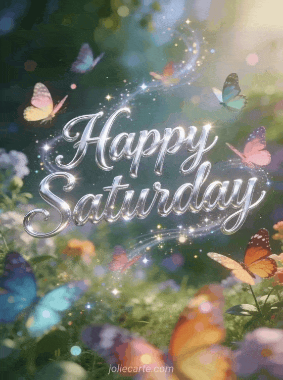 Share a magical happy Saturday animated image with shimmering silver lettering, colorful butterflies and a dreamy enchanted garden. Discover also a happy saturday woman gif or a happy Saturday big kisses gifs.