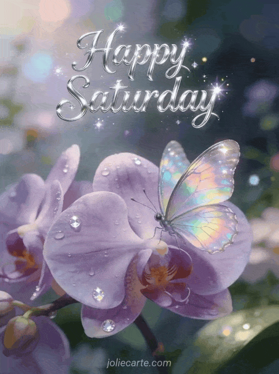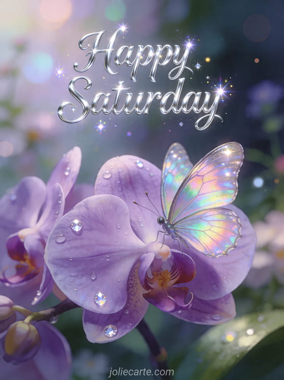 Share a magical Happy Saturday greeting with this free card showing a shimmering butterfly on a purple orchid in a dreamy garden. You can also discover happy saturday good day, happy saturday beautiful images good weekend or free happy saturday card.