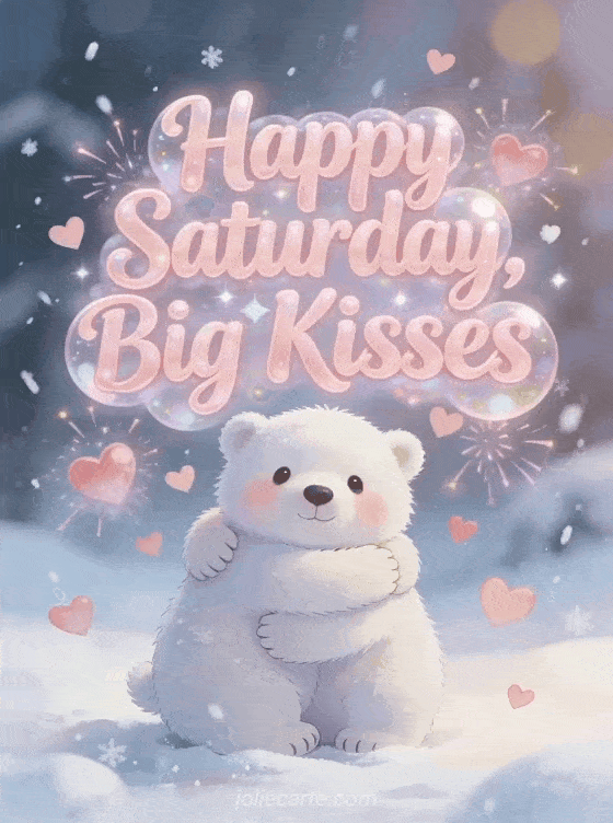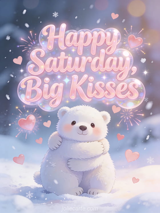 Send happy Saturday big kisses with bubbly pink lettering, floating hearts, soft snow and an adorable polar bear cub offering a warm hug. Discover also a beautiful happy Saturday image or a happy saturday happy weekend kisses.
