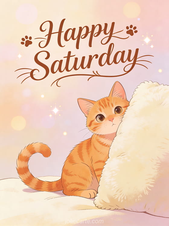 Share a playful Saturday morning greeting with a curious orange tabby cat peeking from behind a cushion. Discover also a happy saturday in the sunshine or a have a great day saturday card.
