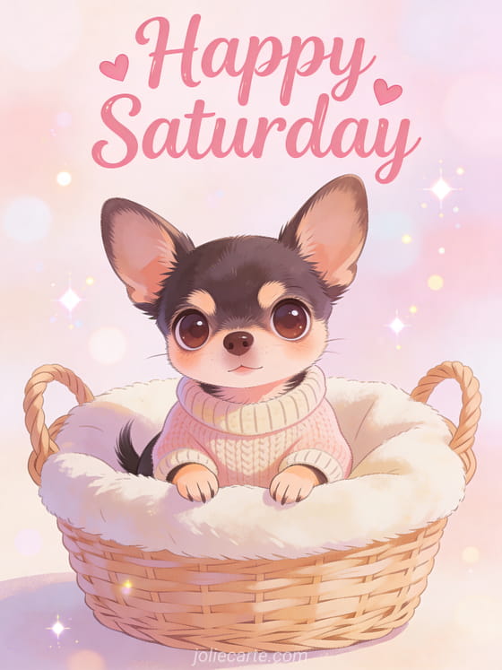 Brighten someone's Saturday with this heartwarming card featuring an adorable chihuahua with giant eyes in a cozy basket. Discover also a happy saturday card or a happy saturday heart.