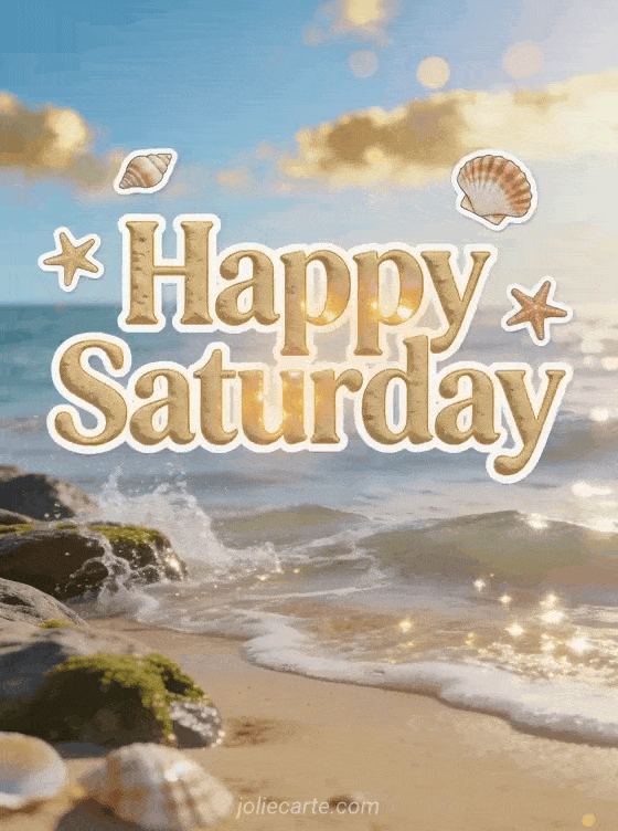 Send a soothing Happy Saturday card with warm golden-sand letters, seashells, starfish, gentle waves breaking on mossy rocks, sparkling sea spray and a blue sky touched with golden clouds. Discover also gifs happy saturday, happy holy saturday or free happy saturday images.