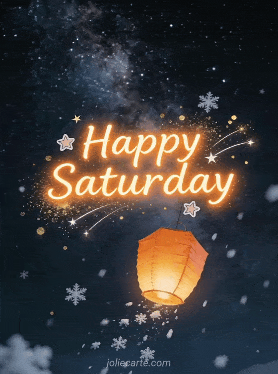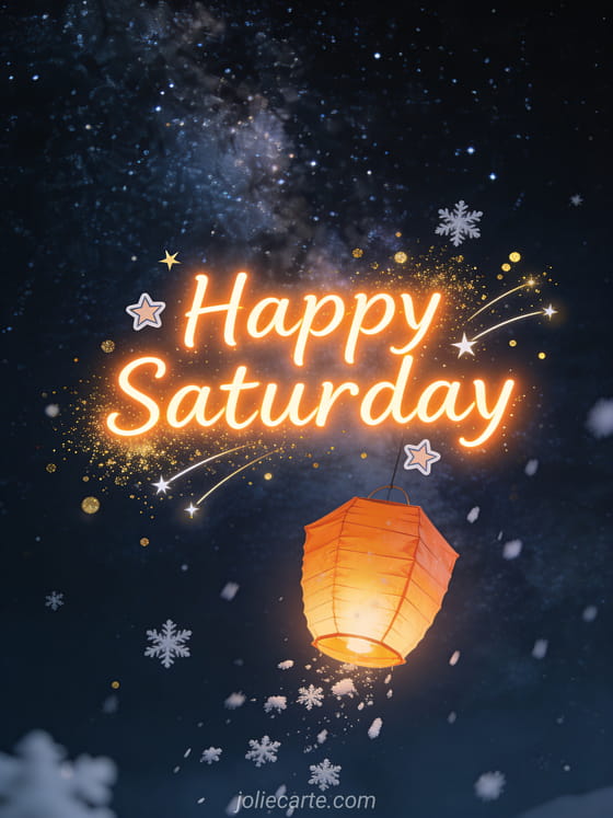Send a magical Happy Saturday evening card with orange glowing letters, shooting stars, golden dust and an orange paper lantern floating through a snowy starry night beneath the Milky Way. Discover also happy sunny Saturday, happy saturday happy weekend images or happy Saturday and good weekend.