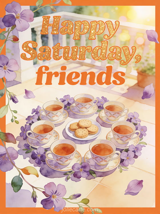 Share a convivial Saturday moment with a watercolor circle of patterned teacups, a little plate of cookies and violet aubrieta blossoms on a sunny terrace. You can also send good morning happy Saturday image, choose happy Saturday animated gif or share very happy saturday gif.