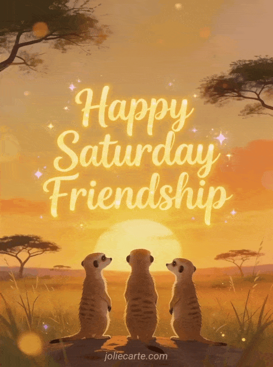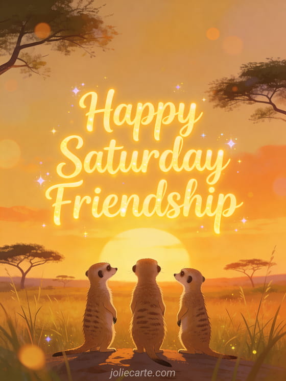 Celebrate friendship this saturday with this heartwarming card featuring three meerkats at sunset. Discover also a happy saturday in the rain card or a good morning saturday quote card.