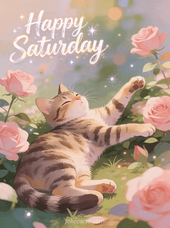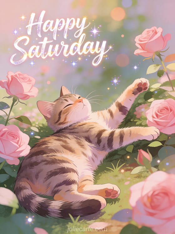 Send a sweet happy Saturday greeting with an adorable tabby cat stretching lazily among pink roses in a cozy garden. A charming way to wish someone a wonderful Saturday. Discover also a good day Saturday card or a cheerful Saturday card.