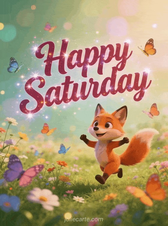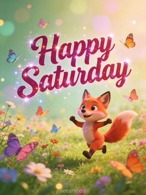Share a fun happy Saturday greeting with a cute fox dancing joyfully in a wildflower meadow, with colorful butterflies around and a lively 3D cartoon style. Discover also beautiful saturday good morning images, a happy Saturday big kisses image or good morning happy saturday.