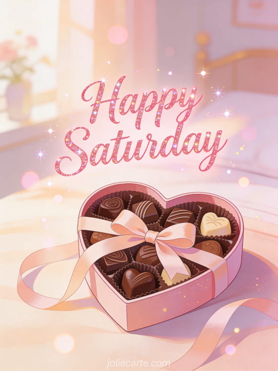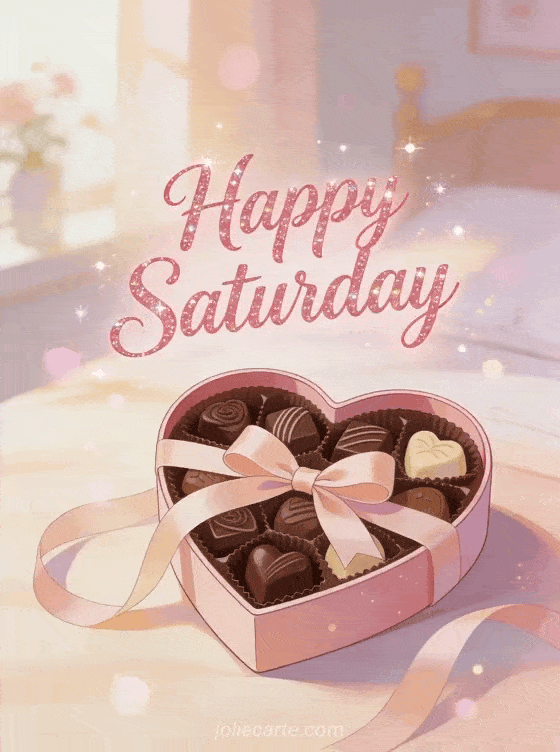 Send a tender happy saturday greeting with blush pink lettering, sparkling hearts and a ribboned box of chocolates for a soft weekend morning. Discover also a happy saturday animated image, a happy saturday woman gif or a happy saturday big kisses gif.