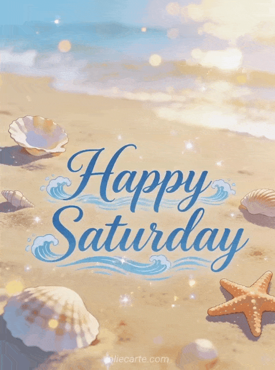 Share happy saturday happy weekend with seashells and starfish on a sandy beach in a calm coastal morning scene. Bring more weekend joy with good morning happy Saturday animated gifs, happy Saturday smiley or Saturday kisses images.