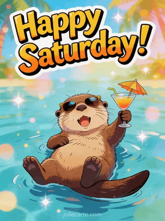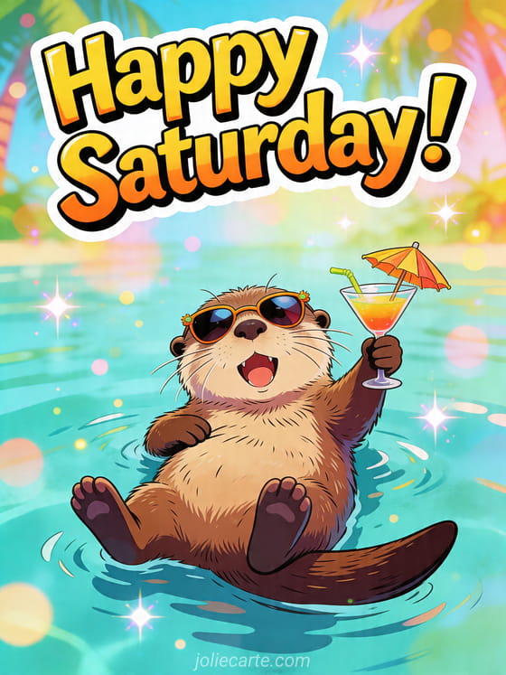 Send laughter for Saturday with this funny card showing a hysterical otter floating on its back with tiny sunglasses and a cocktail on a bright tropical background. You can also discover good saturday evening, happy saturday friends or funny happy saturday humorous.