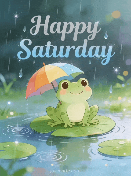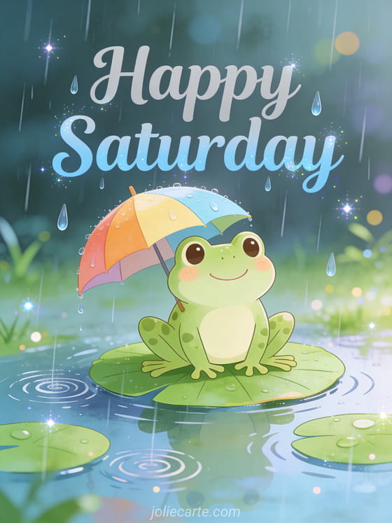 Brighten a rainy saturday with this cheerful card featuring a cute frog under a colorful umbrella on a lily pad. Discover also a thank you happy saturday card or a lovely saturday and happy weekend card.