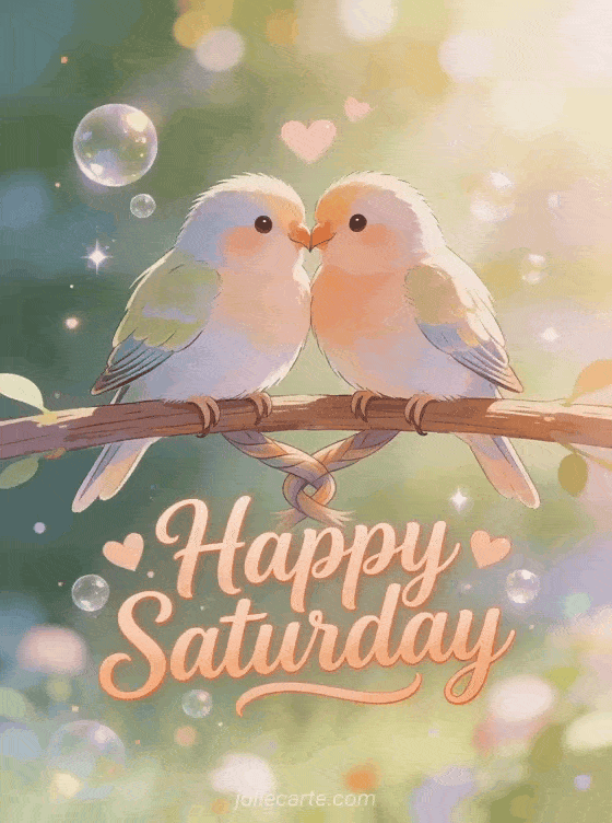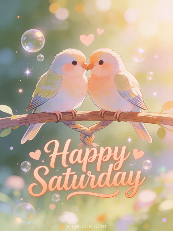 Share a happy saturday kisses image with two lovebirds on a shared perch, surrounded by peach script and heart bubbles in a sweet morning scene. Send more Saturday affection with free happy Saturday image, free virtual happy saturday card or good morning saturday image.