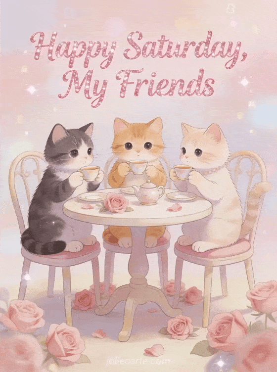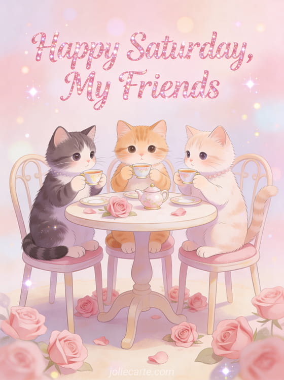 Share a sweet Saturday greeting with three cute kittens having a tea party, tiny cups, pink roses, and soft pastel colors. Discover also an animated image happy saturday or happy saturday everyone gif.