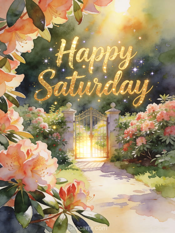 Share a joyful happy Saturday greeting in warm golden lettering, surrounded by a sunlit garden gate and lush rhododendron blossoms. This free card adds sparkling highlights, glossy leaves and a cheerful garden path for a bright weekend moment. Discover also a happy saturday lots of kisses gif card, a happy Saturday and good weekend animated gif card or a free good morning Saturday image card.