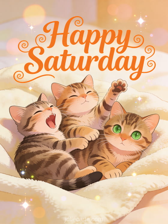 Share happy Saturday with cats in a warm morning scene: three adorable tabby kittens cuddled on a soft cream blanket, with one yawning, one stretching and one looking at the camera. Discover also pretty happy saturday cards or hello saturday landscape.