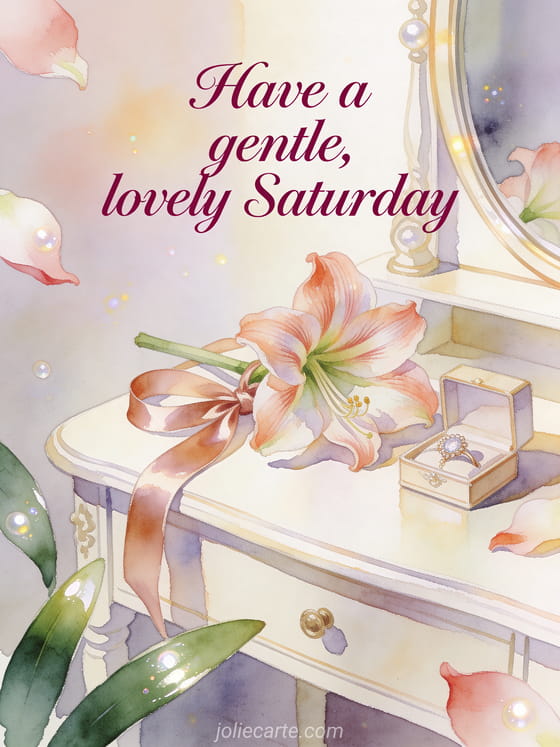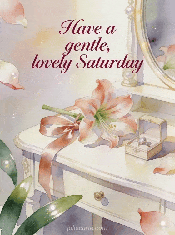 Send a gentle Saturday wish with an amaryllis bloom, a satin ribbon, a small jewelry box and a bright dressing table. Discover also happy Saturday big kisses gifs, great Saturday night gifs or happy saturday snow gif.