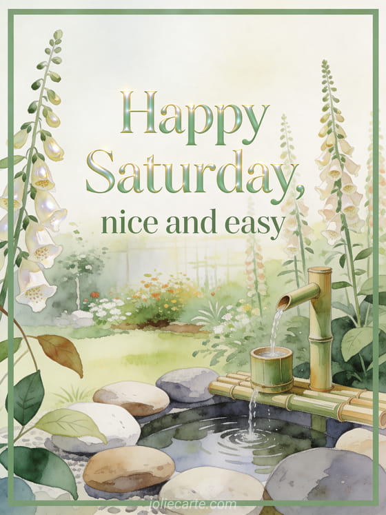 Share a serene watercolor garden corner with smooth river stones, a bamboo fountain, tall foxglove flowers, and gentle golden light. Discover also happy Saturday text, happy Saturday friends image, or good morning happy Saturday image.