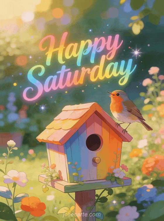 Send a joyful happy Saturday greeting featuring a colorful robin singing on a bird house in a cheerful garden morning. A bright way to wish someone a wonderful Saturday. Discover also a funny Saturday card or a sweet Saturday kisses card.