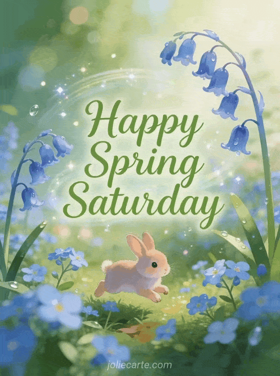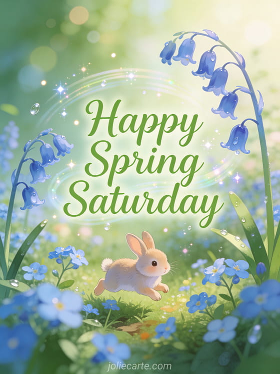 Share a joyful spring Saturday greeting with a cute baby bunny hopping through bluebells and forget-me-nots, with morning dew and fresh light. Discover also beautiful day happy Saturday kisses or a good morning saturday card.