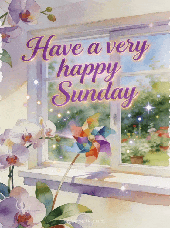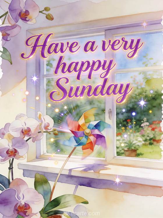 Celebrate Sunday with a bright watercolor card featuring a colorful paper pinwheel, orchid blooms and a sunny garden windowsill. You can also send happy Sunday friends gif, share happy Sunday beach gif or choose happy Sunday everyone images.