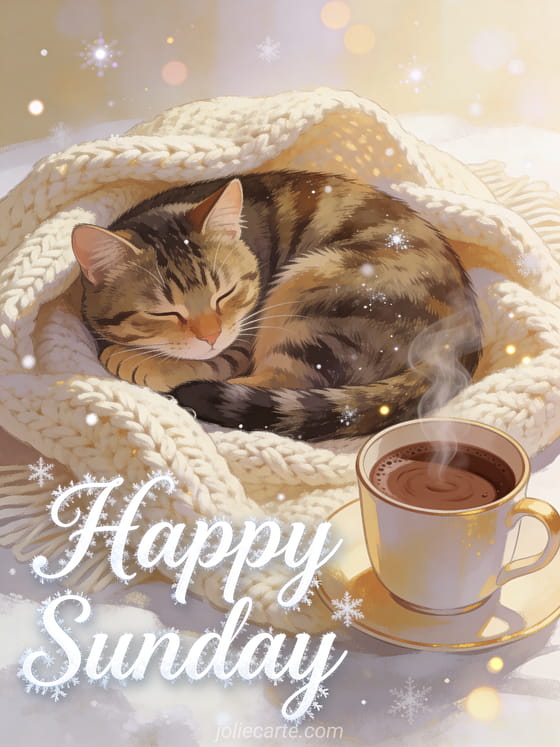 Happy sunday cold a cozy winter Sunday greeting with a tabby cat and hot chocolate