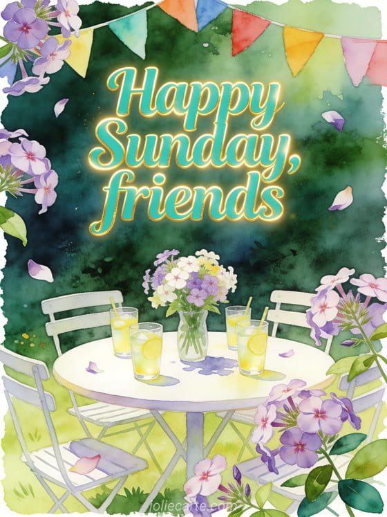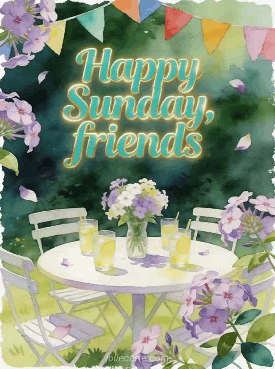Send happy Sunday friends images with turquoise lettering, a round garden table, lemonade glasses, phlox flowers and colorful bunting. Discover also a happy Sunday flower bouquet image, sunny happy Sunday gifs or a gray happy Sunday image.
