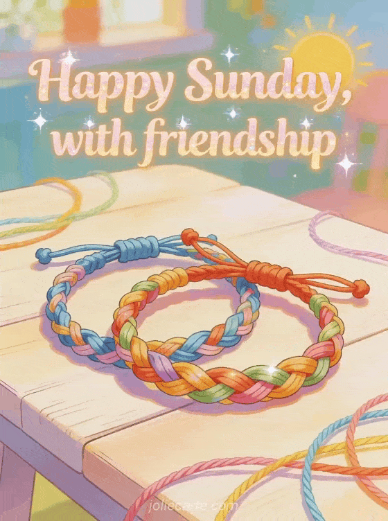 Send a warm happy Sunday friendship greeting with pastel lettering, sparkling accents, braided bracelets on a bright wooden table, colorful threads, sunny tones and a friendly mood. You may also like this good morning hi happy Sunday, this happy Sunday in June or this happy Sunday coffee gif.