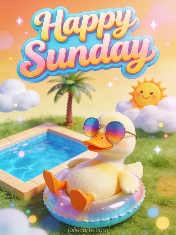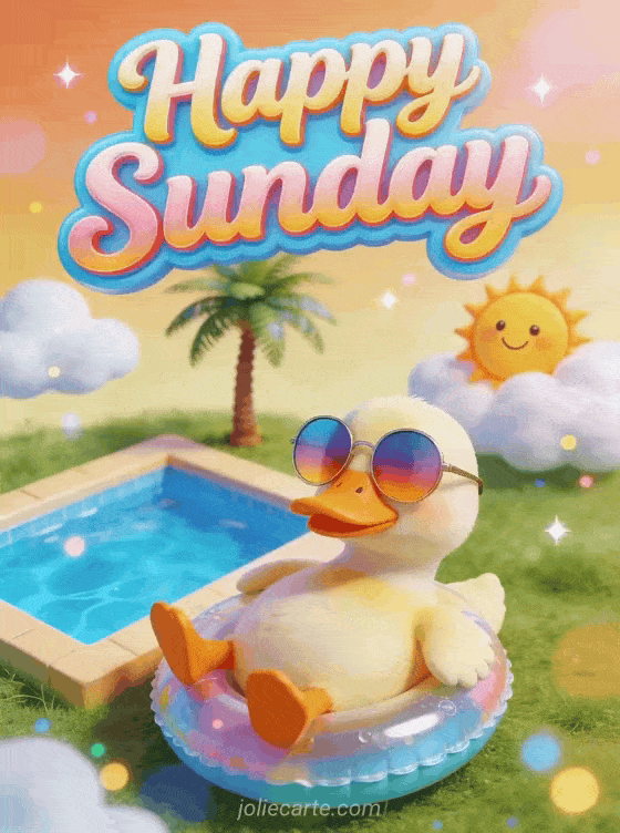 Share happy sunday gif funny with a duck wearing oversized sunglasses and lounging by a tiny pool in an absurd summer scene. Keep Sunday cheerful with happy sunday evening, happy Sunday friendship or happy Sunday in the Lord.