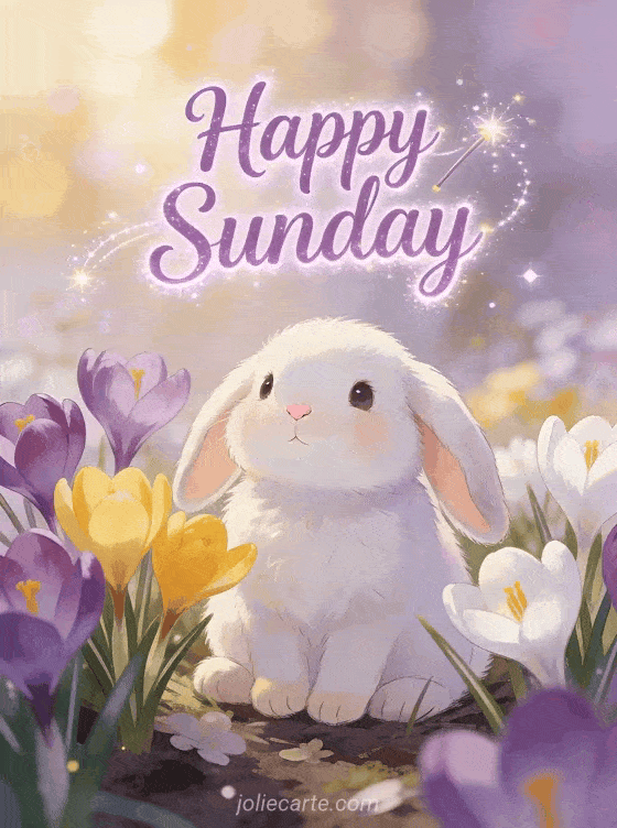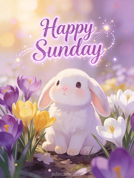 Brighten someone's Sunday with this adorable card featuring a cute bunny surrounded by spring crocuses in a magical awakening scene. Discover also a happy Sunday images card, a good morning happy Sunday kisses card or a funny happy Sunday gif card.