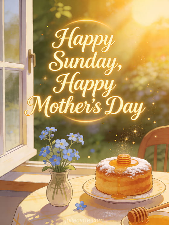 Share a bright Mother's Day card for Sunday morning, with honey-gold script, an open window, forget-me-nots, a honey cake, and golden light. Discover also wish your mom a happy Mother's Day, Mother's Day quotes, or happy Mother's Day to my aunt.