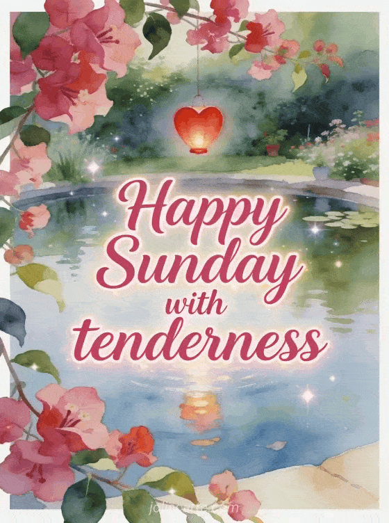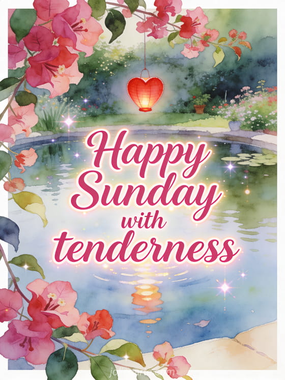 Share happy Sunday with tenderness with raspberry lettering, a floating red heart lantern above a calm garden pond and bougainvillea flowers sweeping over the border. Discover also good morning sunday images, very happy Sunday images or happy Sunday friends images.