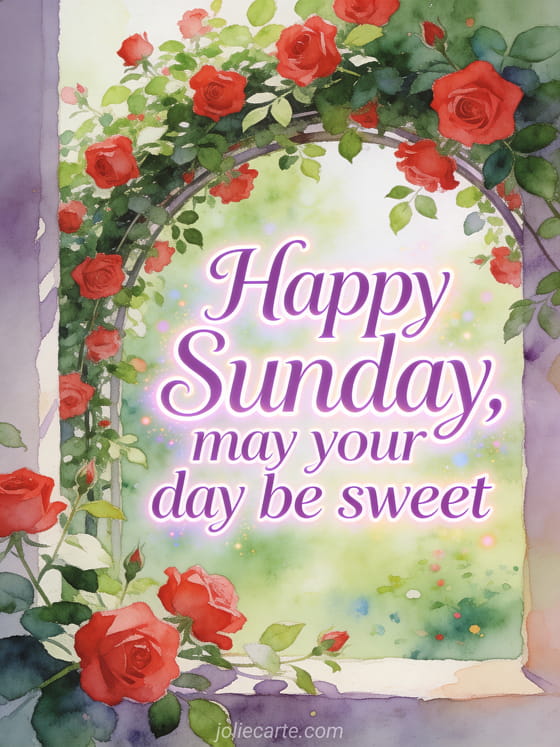Share a gentle Sunday message with elegant violet lettering, red roses, fresh leaves, and blossoms crossing the border of a luminous watercolor garden arch. You can also send a message to say happy Sunday, a free happy Sunday image, or a happy sunday sun gif.