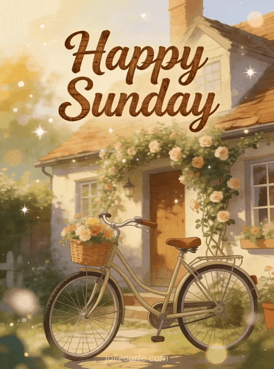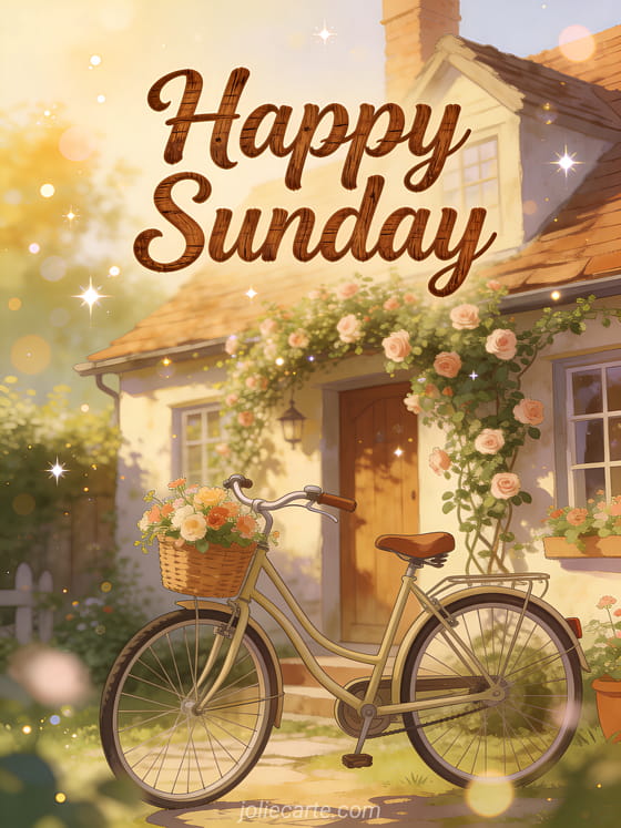 Wish a happy Sunday with this nostalgic card featuring a charming vintage bicycle with a flower basket in front of a quaint cottage with climbing roses in a peaceful countryside setting. Discover also a good morning happy Sunday kisses, a funny happy Sunday gif or happy Sunday kisses images.