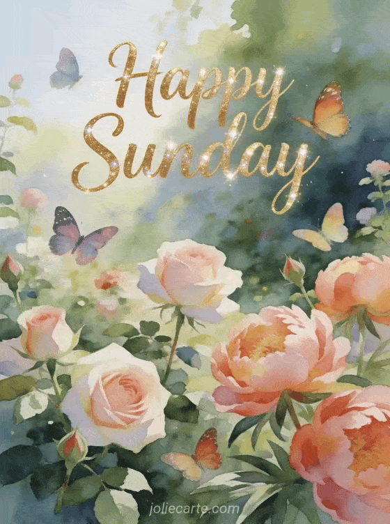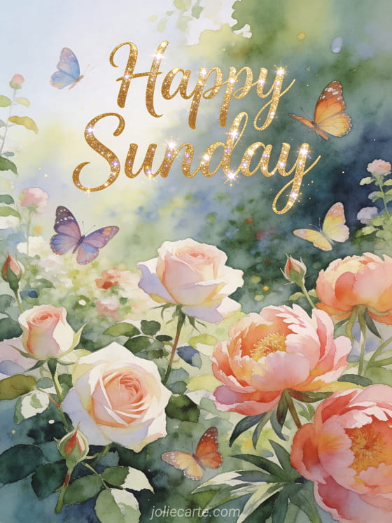 Share a delicate Sunday greeting with a lush early-summer garden, blooming roses and peonies, colorful butterflies, and soft watercolor light. Discover also good morning hi happy Sunday or happy Sunday friendship images.