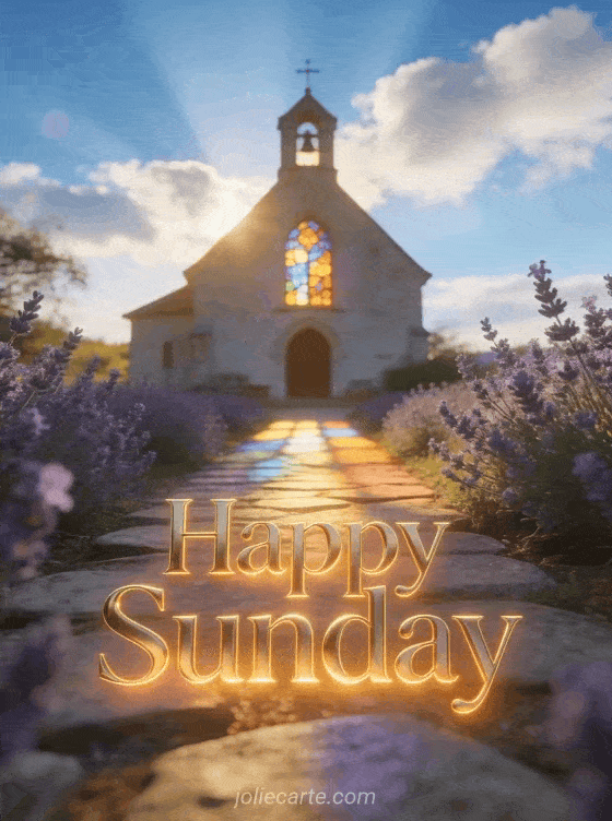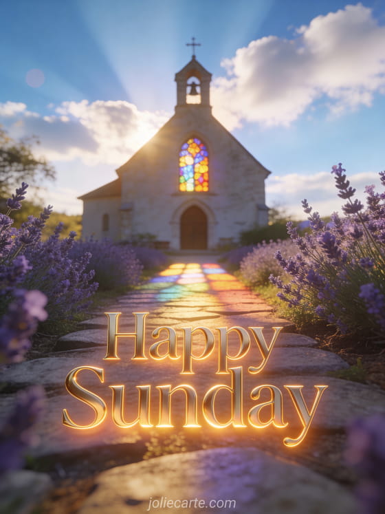 Share a luminous Sunday greeting with a country chapel, golden morning light, colorful stained glass reflections, a stone path, and blooming lavender. Discover also happy sunday sparkling animated gif or good morning happy Sunday good morning good day.